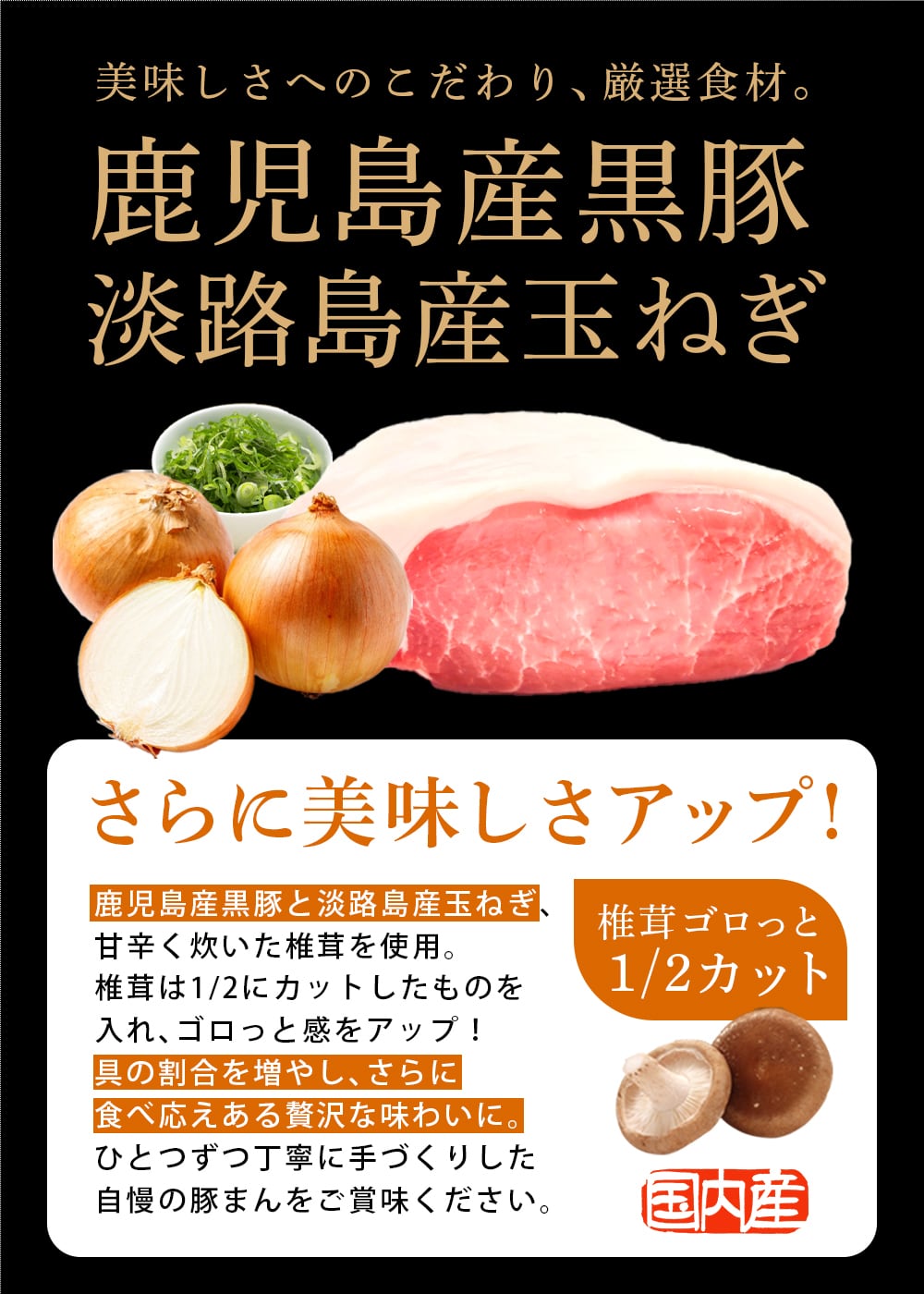 原材料:小麦粉(国内製造)、豚肉(国産)、豚脂(国産)、玉ねぎ、味付け椎茸(砂糖、しょうゆ、乾燥しいたけ)、砂糖、でん粉、しょうゆ、ねぎ、液全卵、パン粉、イースト、鶏だしの素、食塩、甜麺醤、胡椒、脱脂粉乳/調味料(アミノ酸等)、(一部に小麦・卵・乳成分・ごま・大豆・鶏肉・豚肉を含む)※本製造工場では、えび、カニを含む製品を製造しております。